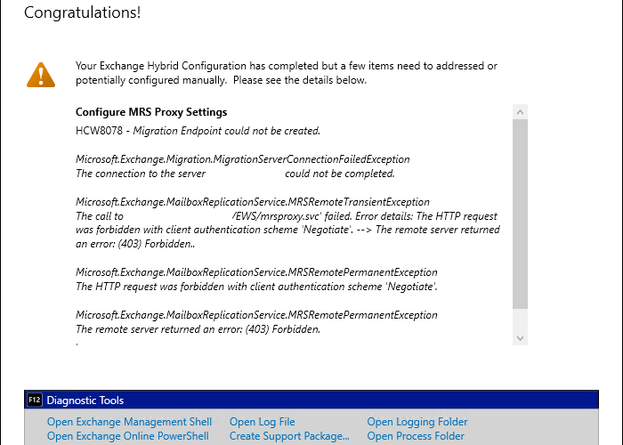 Exchange Hybrid Configuration Wizard’ı tekrar çalıştırdığınızda sorunsuz kurulum yapacaktır.