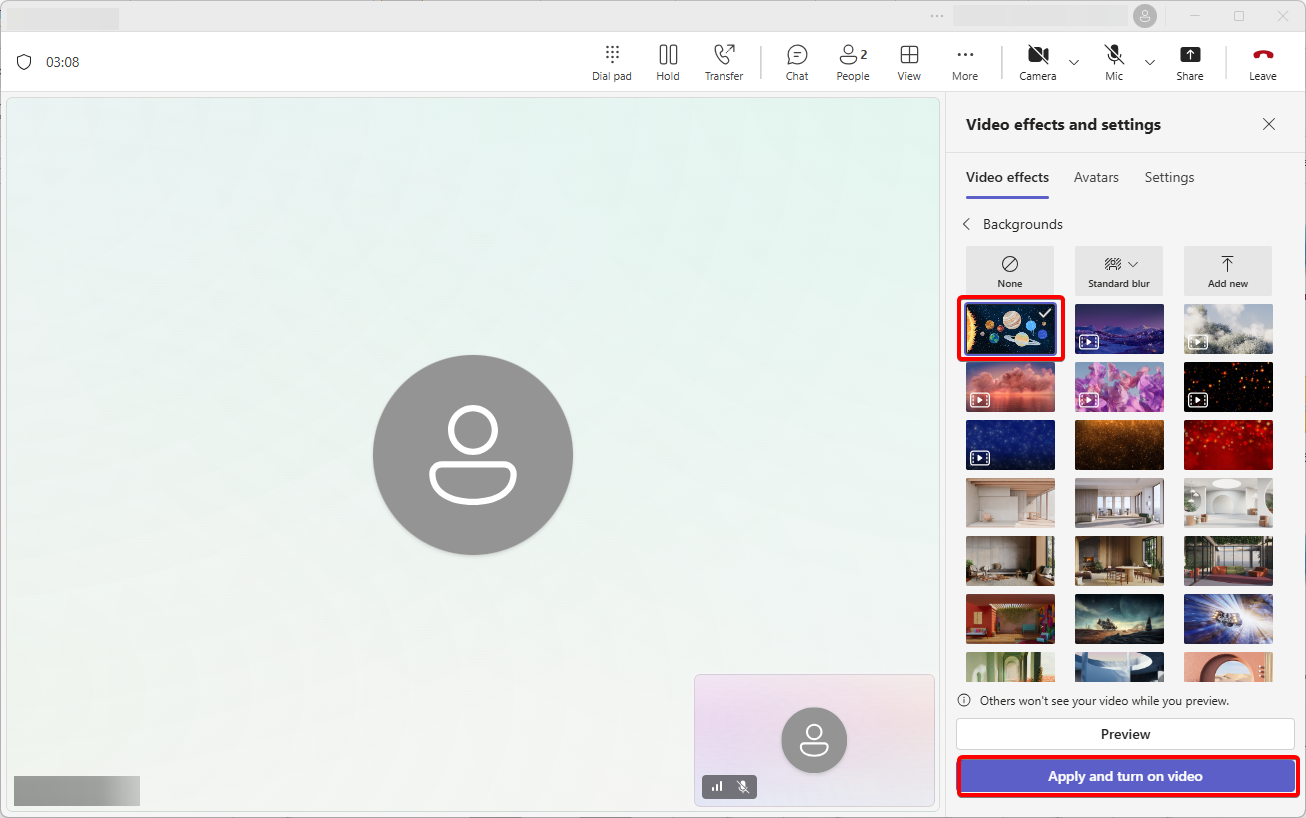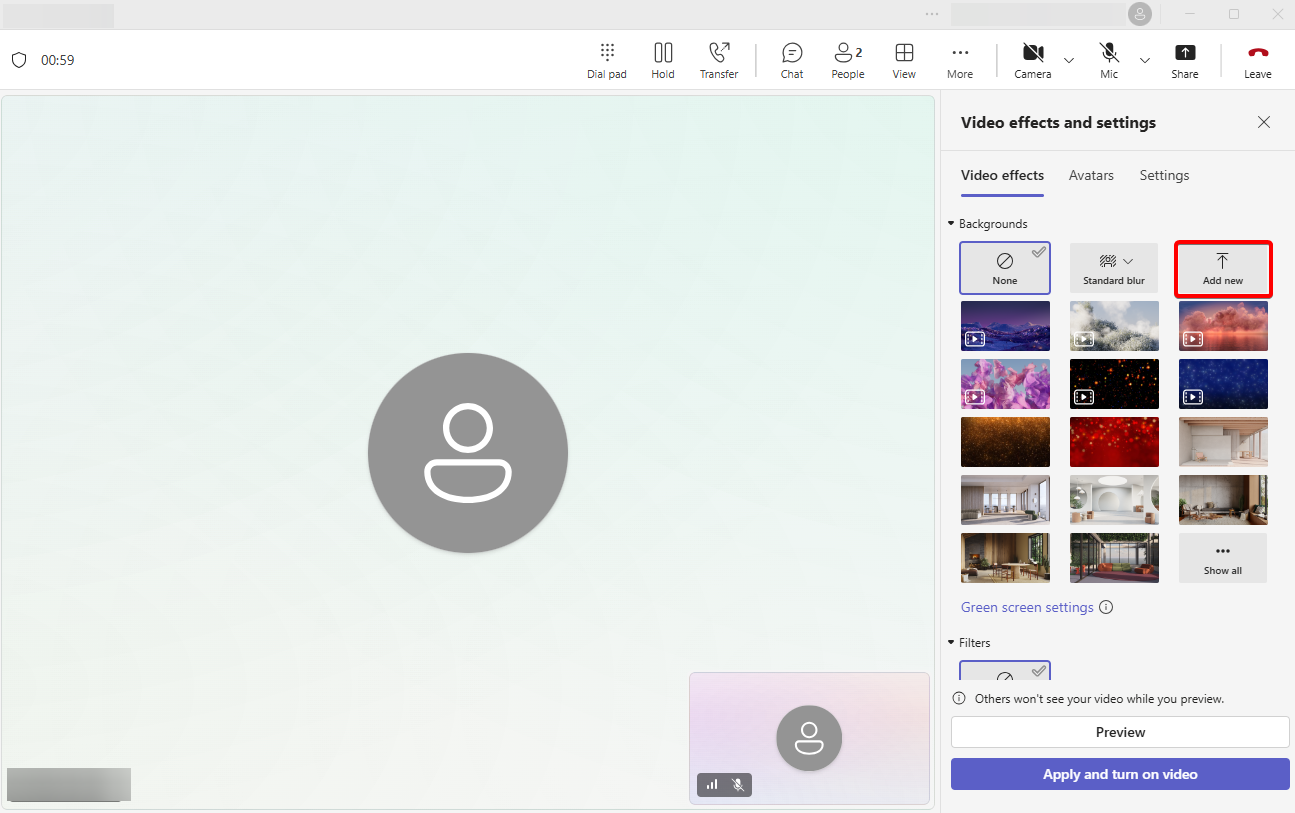 “Create a Teams meeting with another account and invite your own. Open the New Teams client and join the meeting. Click ‘More’ then ‘Video effects,’ and select ‘Add new’ to upload your custom background.