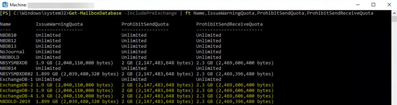 Get-Mailbox -IncludePreExchange | ft Name,IssueWarningQuota,ProhibitSendQuota,ProhibitSendReceiveQuota