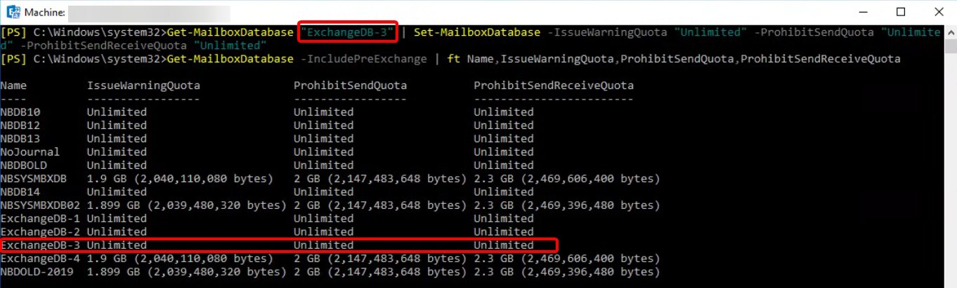 Get-MailboxDatabase "ExchangeDB-3" | Set-MailboxDatabase -IssueWarningQuota "Unlimited" -ProhibitSendQuota "Unlimited" -ProhibitSendReceiveQuota "Unlimited"