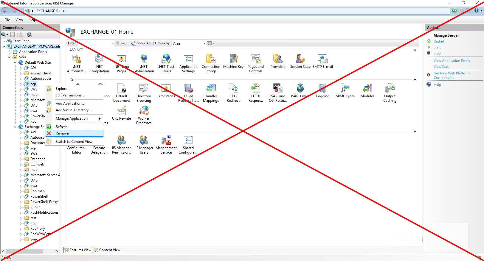Note:Do not use IIS Manager to remove the Exchange virtual directory. Utilize the Exchange Management Shell for a clean and supported removal process.