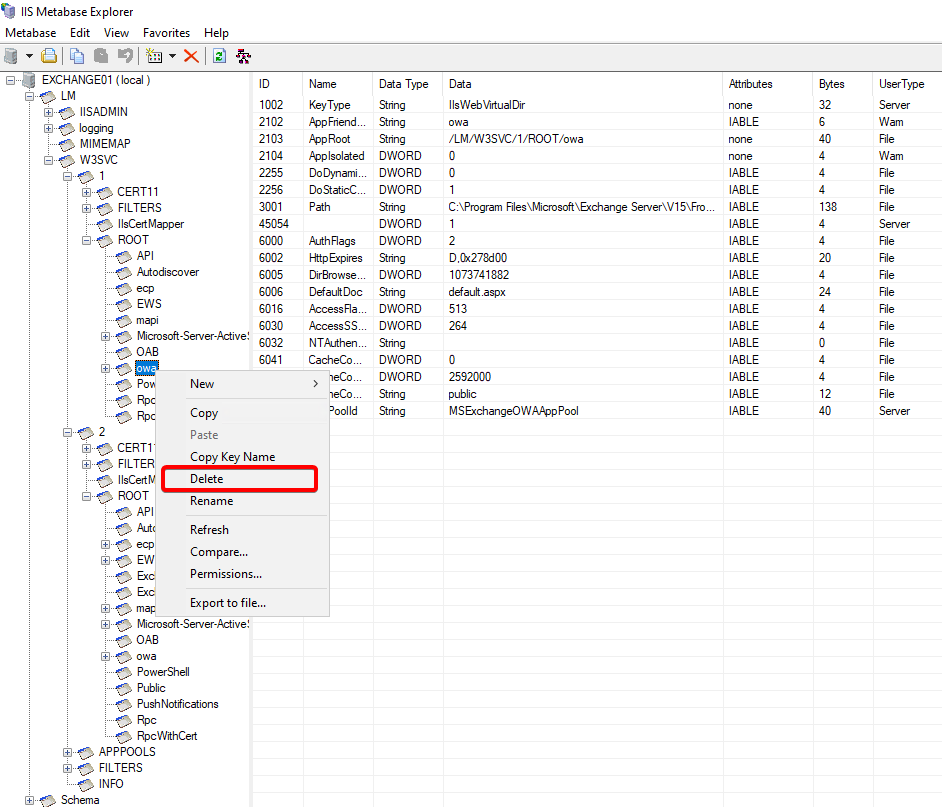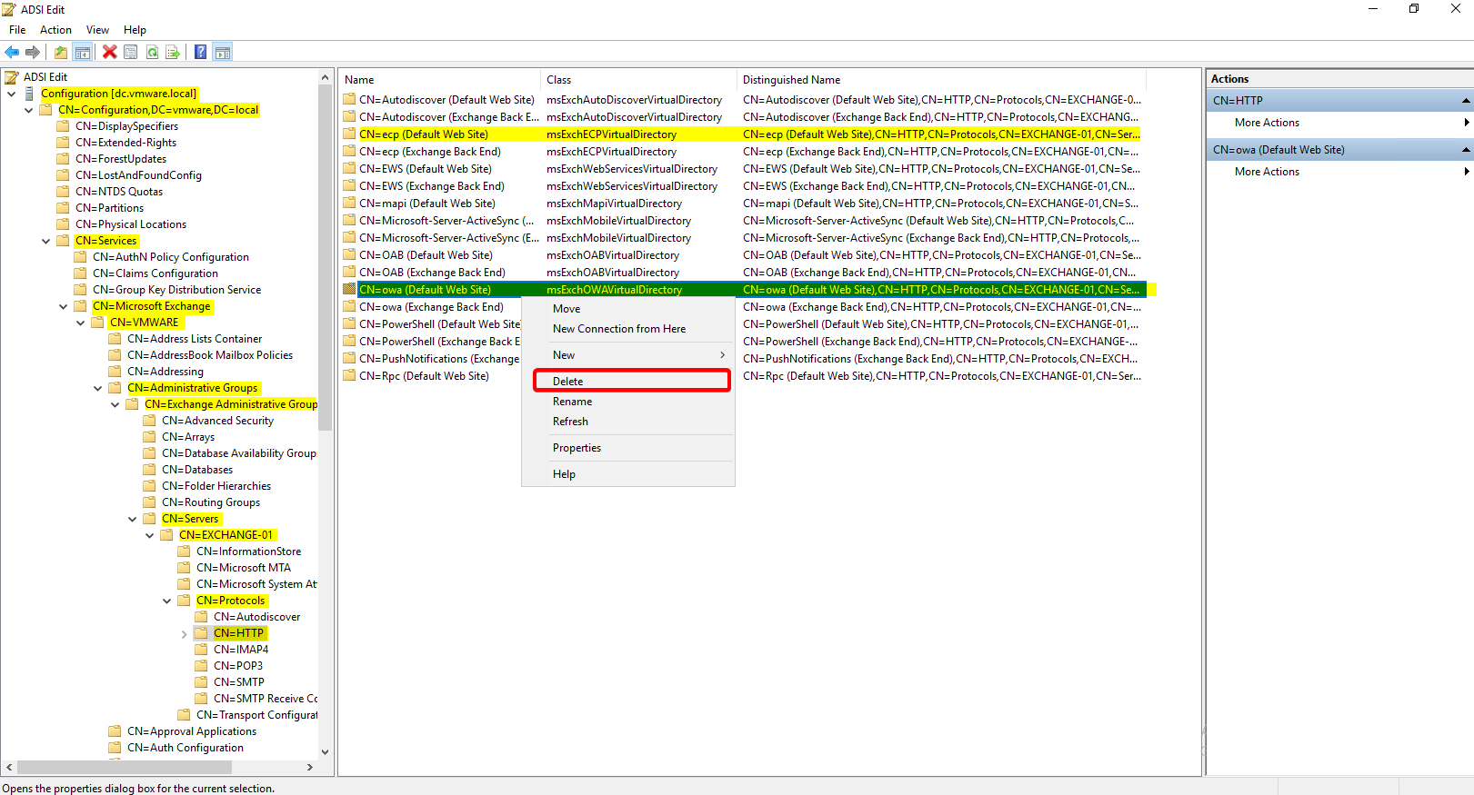 Option 2: Manually delete the OWA virtual directory via ADSI Edit