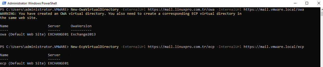 New-OwaVirtualDirectory -Server "EXCHANGE01" -InternalUrl "https://mail.linuxpro.com.tr/ecp" -ExternalUrl "https://mail.linuxpro.com.tr/ecp"