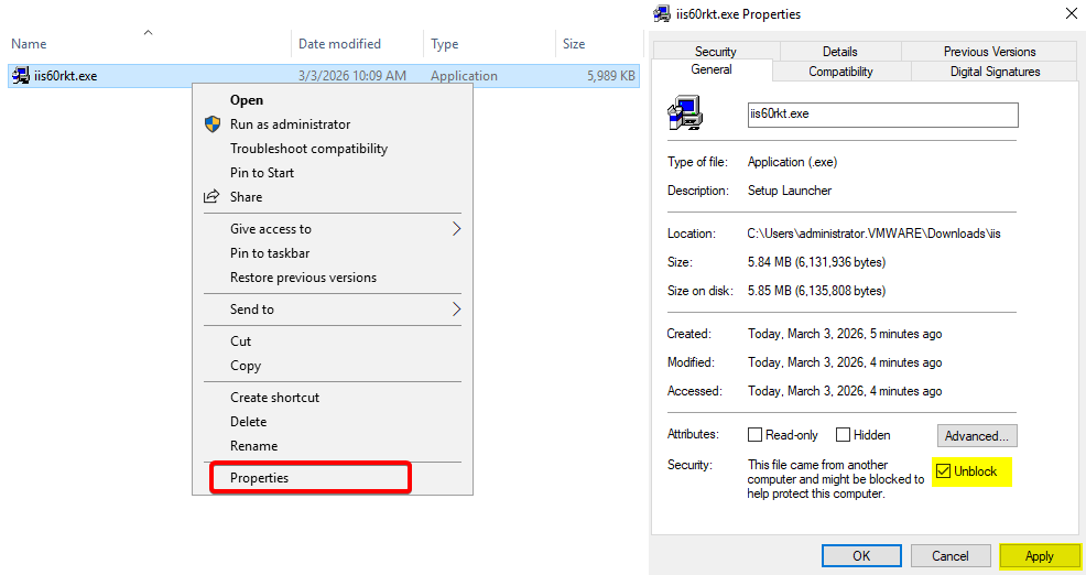 Right-click iis60rkt.exe and select Properties. If present, check the “Unblock” box and click OK to apply the changes.