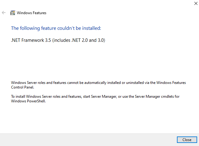 Run Microsoft Metabase Explorer 1.6. Check if you encounter the following prompt: “The feature .NET Framework 3.5 couldn’t be installed.”