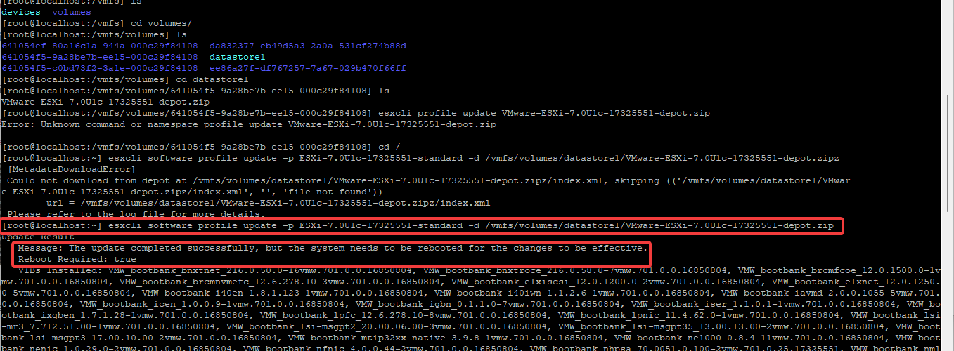 esxcli software profile update -p ESXi-7.0U1c-17325551-standard -d /vmfs/volumes/datastore1/VMware-ESXi-7.0U1c-17325551-depot.zip