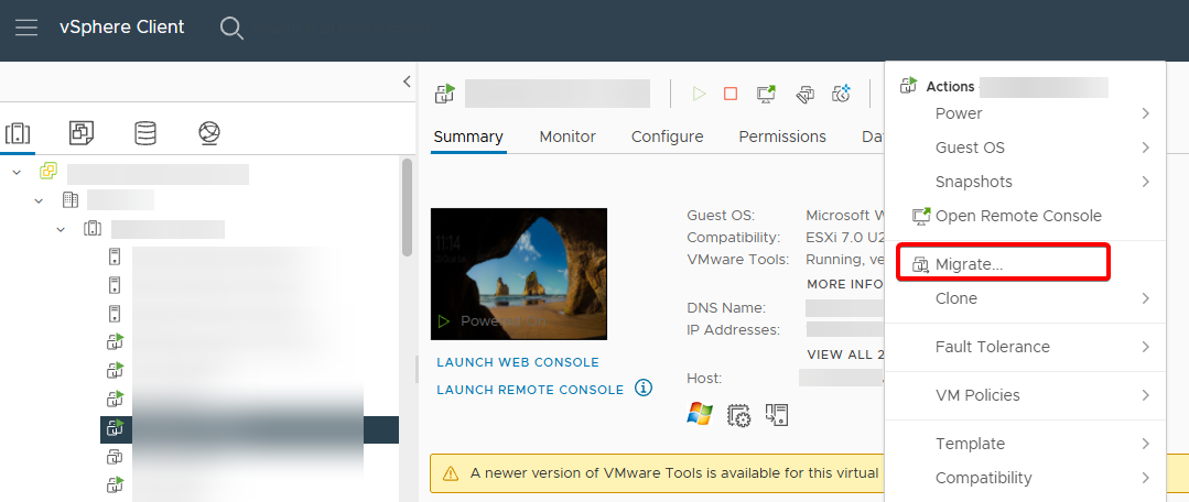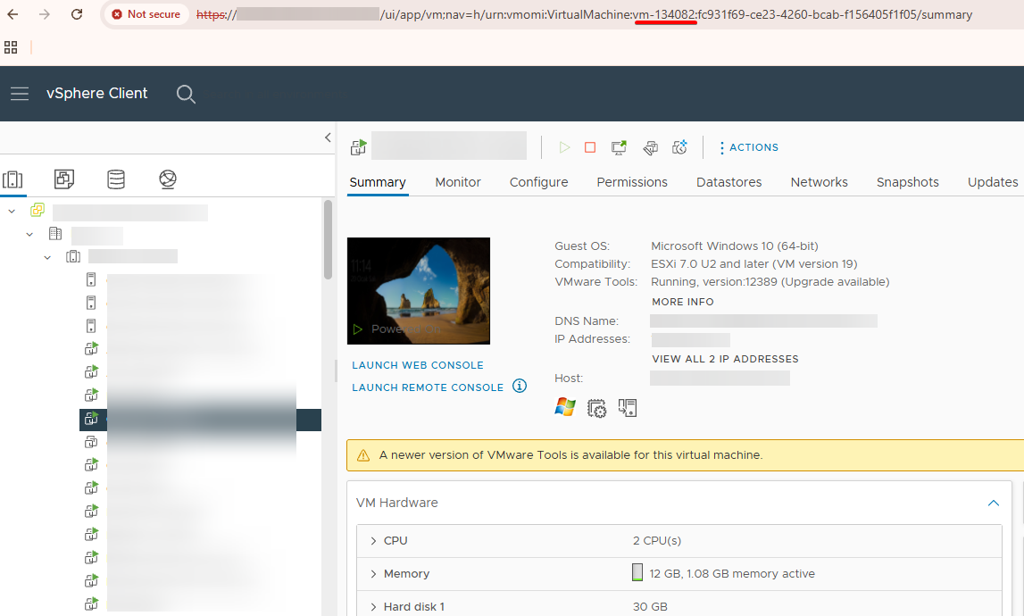vCenter Web İstemcisini açın ve sol taraftaki envanterde etkilenen sanal makineyi seçin. Web adres çubuğunda sanal makine numarasını arayın. Bu durumda MOB ID vm-134082’dir.