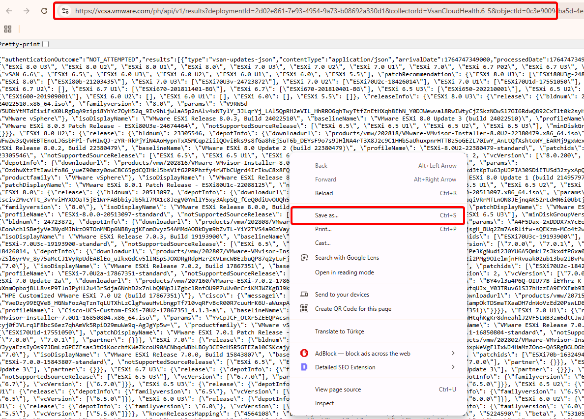 https://vcsa.vmware.com/ph/api/v1/results?deploymentId=2d02e861-7e93-4954-9a73-b08692a330d1&collectorId=VsanCloudHealth.6_5&objectId=0c3e9009-ba5d-4e5f6-bae8-f25ec506d219&type=vsan-updates-json